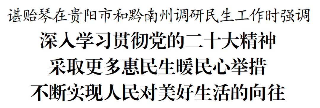 11月28日和29日,省委书记、省人大常委会主任谌贻琴深入贵阳市南明区、云岩区、观山湖区和黔南州长顺县、惠水县,调研民生工作。她强调,要深入学习贯彻党的二十大精神和习近平总书记关于保障和改善民生的重要论述,坚持以人民为中心的发展思想,采取更多惠民生、暖民心举措,用心用情用力做好民生工作,着力解决好人民群众急难愁盼问题,推动人民群众在高质量发展中共享高品质生活,让现代化建设成果更多更公平惠及全省人民,不断实现人民对美好生活的向往。省领导吴强、胡忠雄、陈少波参加有关调研活动。