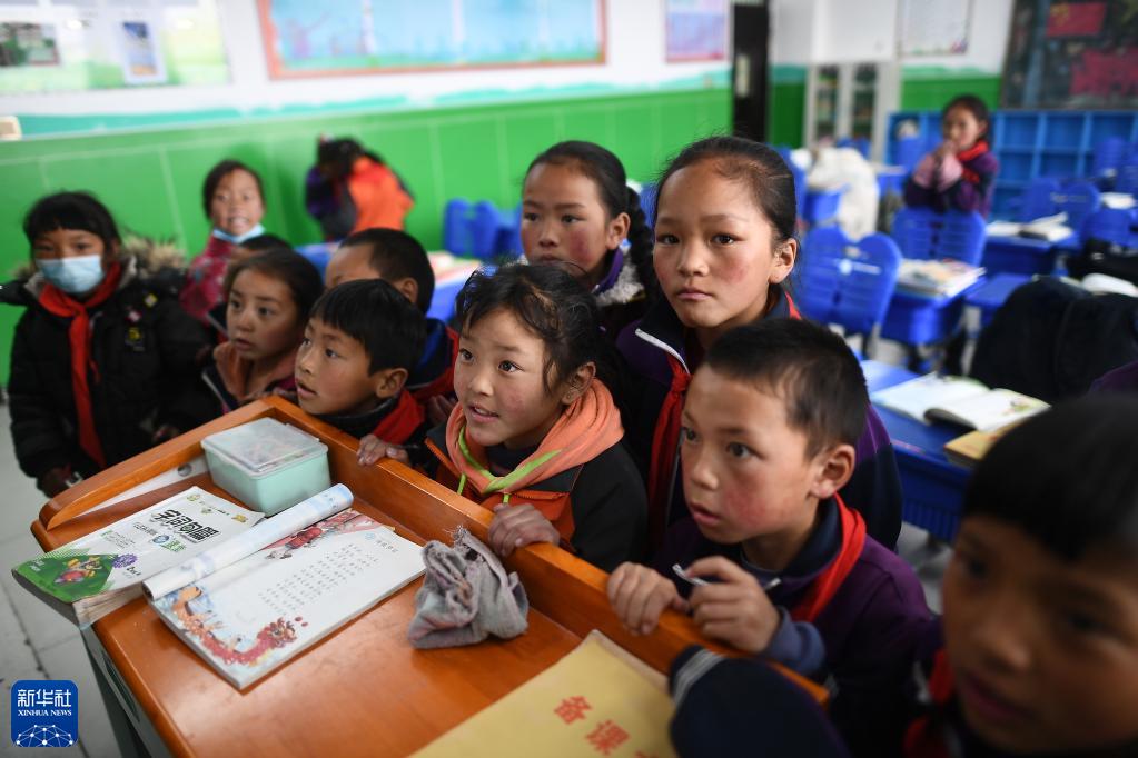 青海省果洛藏族自治州玛多县民族寄宿制中学二年级的学生在课间观看多媒体课件(2021年3月26日摄)。该校采用清洁取暖方式后,学生的学习和生活环境大为改善。新华社记者 张宏祥 摄