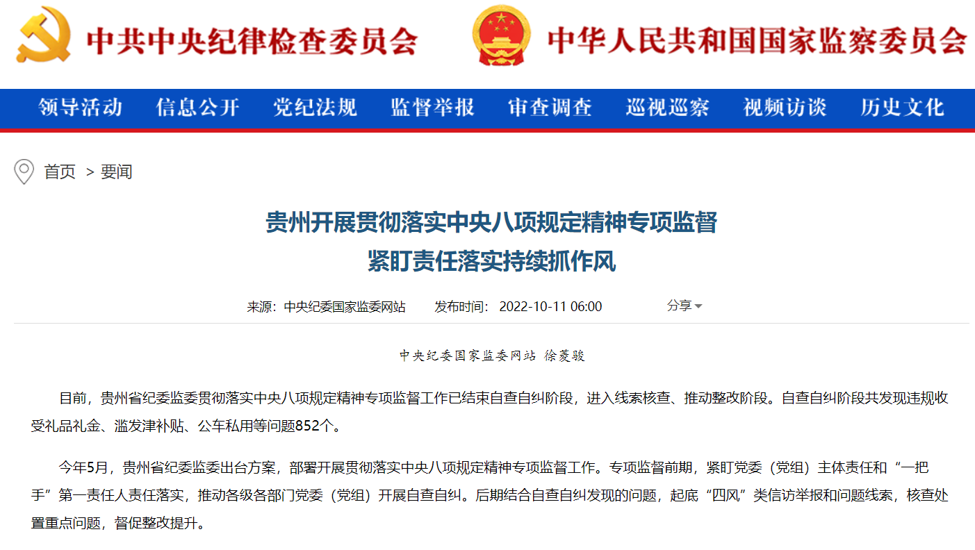 目前,贵州省纪委监委贯彻落实中央八项规定精神专项监督工作已结束自查自纠阶段,进入线索核查、推动整改阶段。自查自纠阶段共发现违规收受礼品礼金、滥发津补贴、公车私用等问题852个。